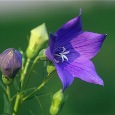 桔梗花,属植物桔梗的开花,别名为铃铛花、僧冠帽、苦根菜、梗草、包袱花、六角荷、白药,茎高20-120厘米,通常无毛,偶密被短毛,不分枝,极少上部分枝。李时珍在《本草纲目》中释其名曰:“此草之根结实而梗直,故名桔梗”。桔梗根药用,含桔梗皂甙,有止咳、祛痰、消炎等效。