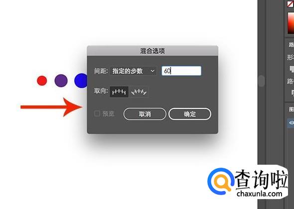 选择混合工具之后按回车键进行混合选项界面,将间距设置为“指定的步数”,调整步数后点击确定。