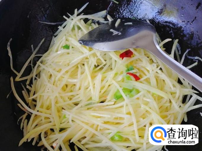 加入香醋后快速翻炒均匀,小编一边炒菜一边拍照,锅底的土豆丝都快糊了,炒至土豆丝看上去变软就可以了,确定不了生熟的可以品尝一下,炒熟后加入适量食盐,口味重的也可以加点生抽炒匀就可以了。