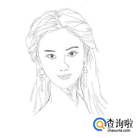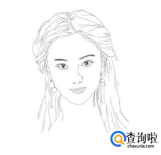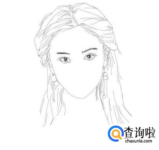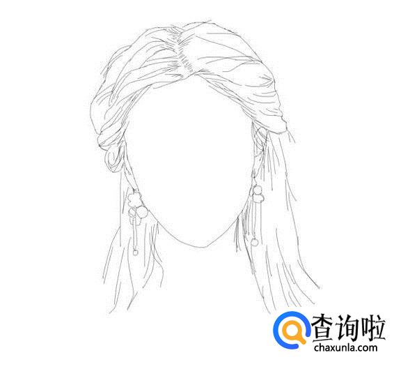 再在头发的基础上画出人物的面部,然后在面部上画出人物的耳朵,并在耳朵上画出耳坠,再在面部的下面画出面部两侧的头发,如图所示: