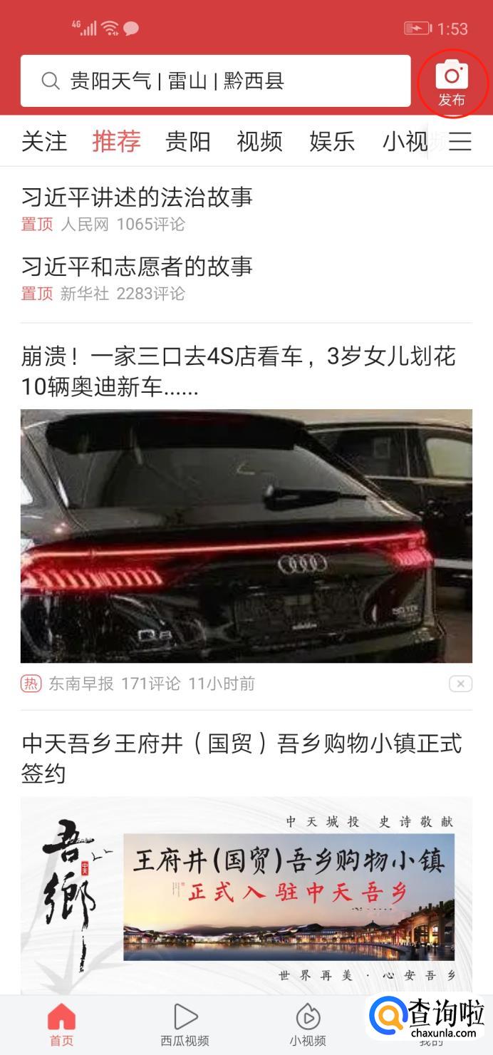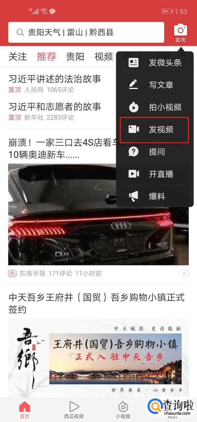 下载好今日头条后,注册个账号,在首页右上角点击发布,再点击发视频。