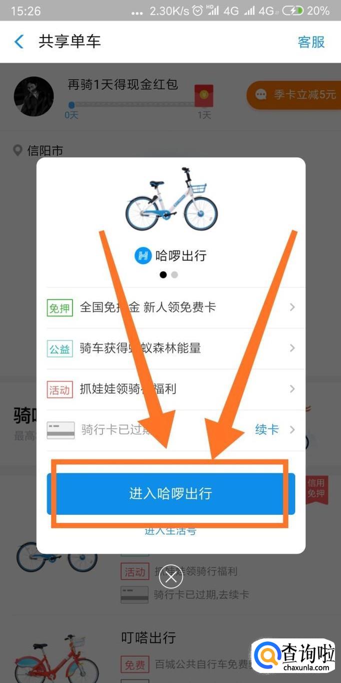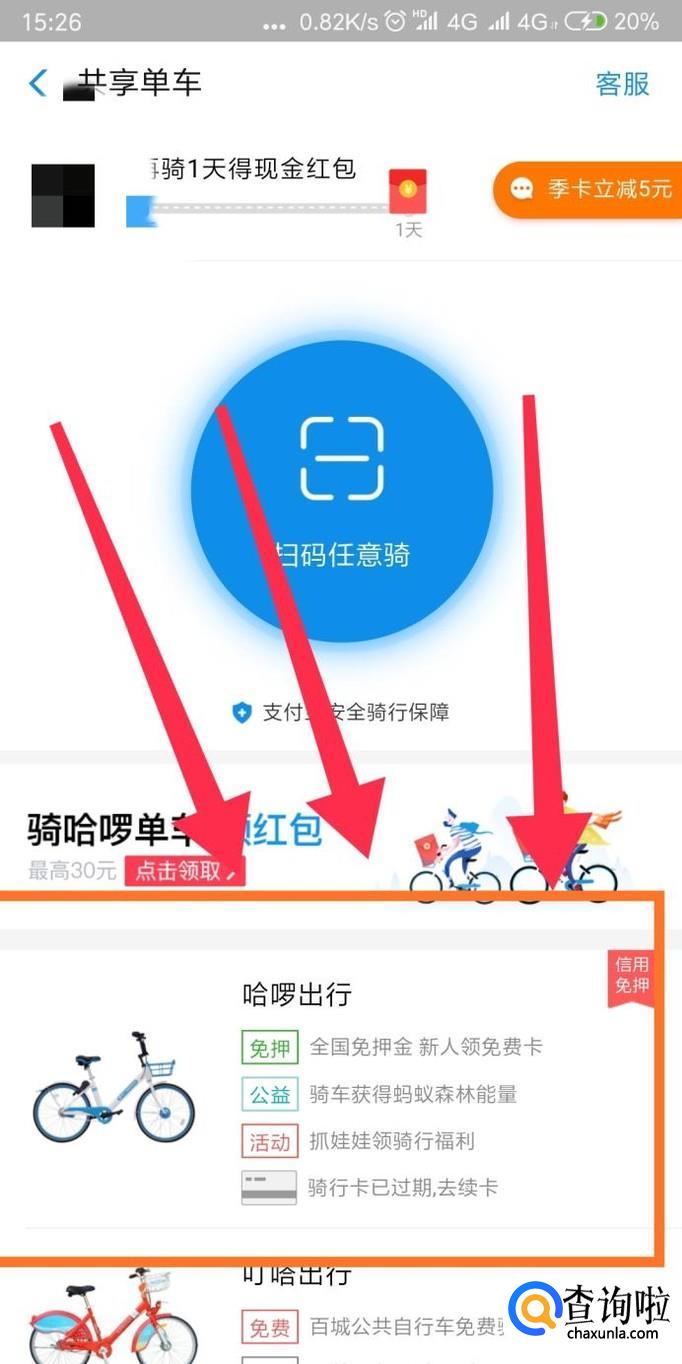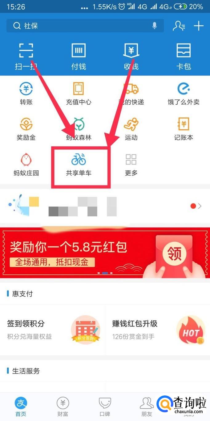 进入支付宝首页后,点击“共享单车”,如果没有可以点击“更多”,打开之后,找到共享单车,点击打开。