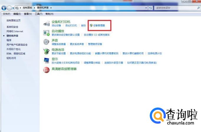 进入控制面板后,点击“硬件与声音”选项,并在设备和打印机的下属选项中点击“设备管理器”。