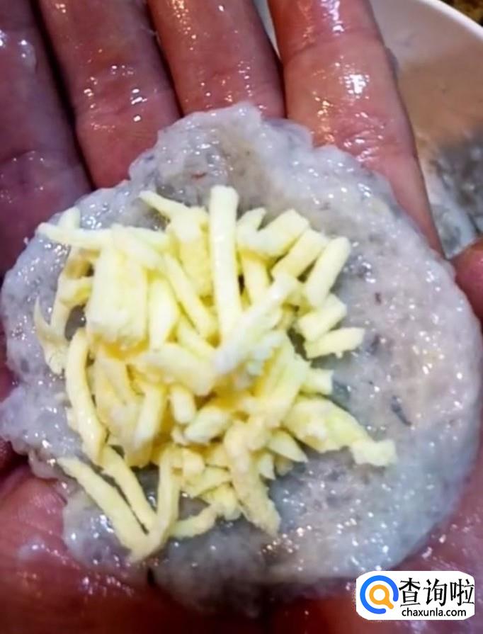 然后我们将虾泥压成一个个的皮,包上芝士,团成球,裹一层面包糠,插上虾尾