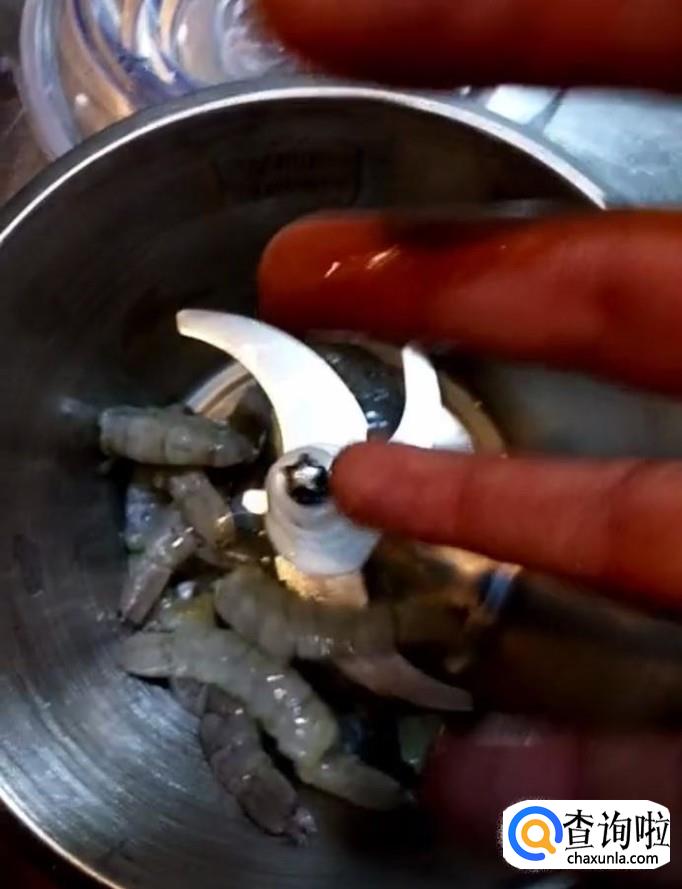 然后我们将虾肉放入料理机,放入一小块姜,将其打成虾泥