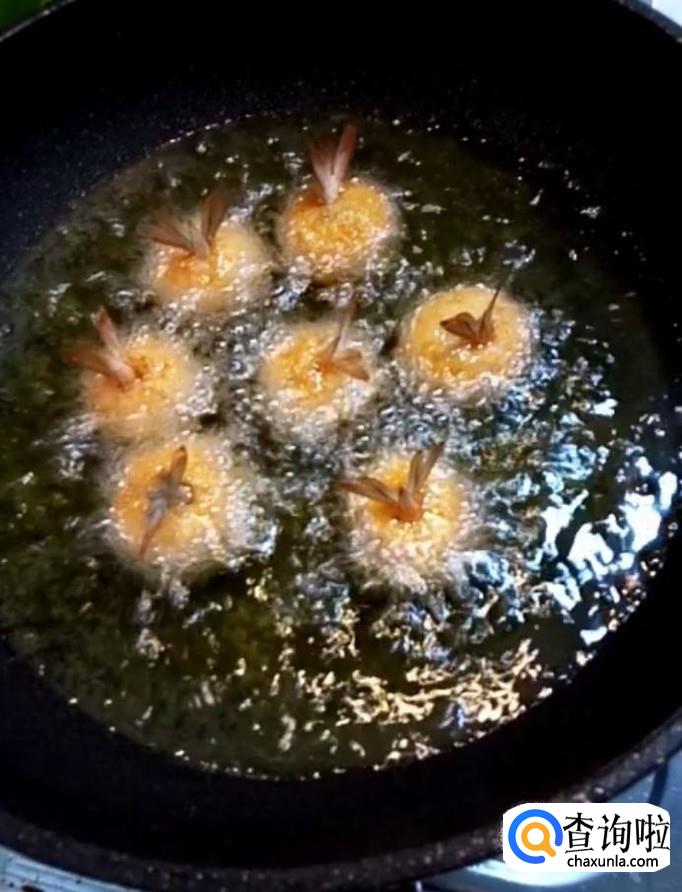 接着我们在锅中烧油,油温四成热,下入虾球,小火炸至金黄捞出