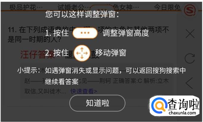 敲黑板!使用小窗模式需要搜狗搜索使用手机的“悬浮窗”权限,如果开启失败,请在手机系统设置->更多设置->权限管理->搜狗搜索中,打开搜狗搜索的“悬浮窗”权限,再回到App中点击“小窗模式”即可解决此问题;(设置路径不同手机有所不同,可寻找权限设置或者安全中心等)