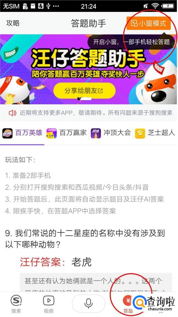 使用安卓5.9.0.9及以上版本的搜狗搜索App,进入底栏“答题”页,点击右上角“小窗模式”;