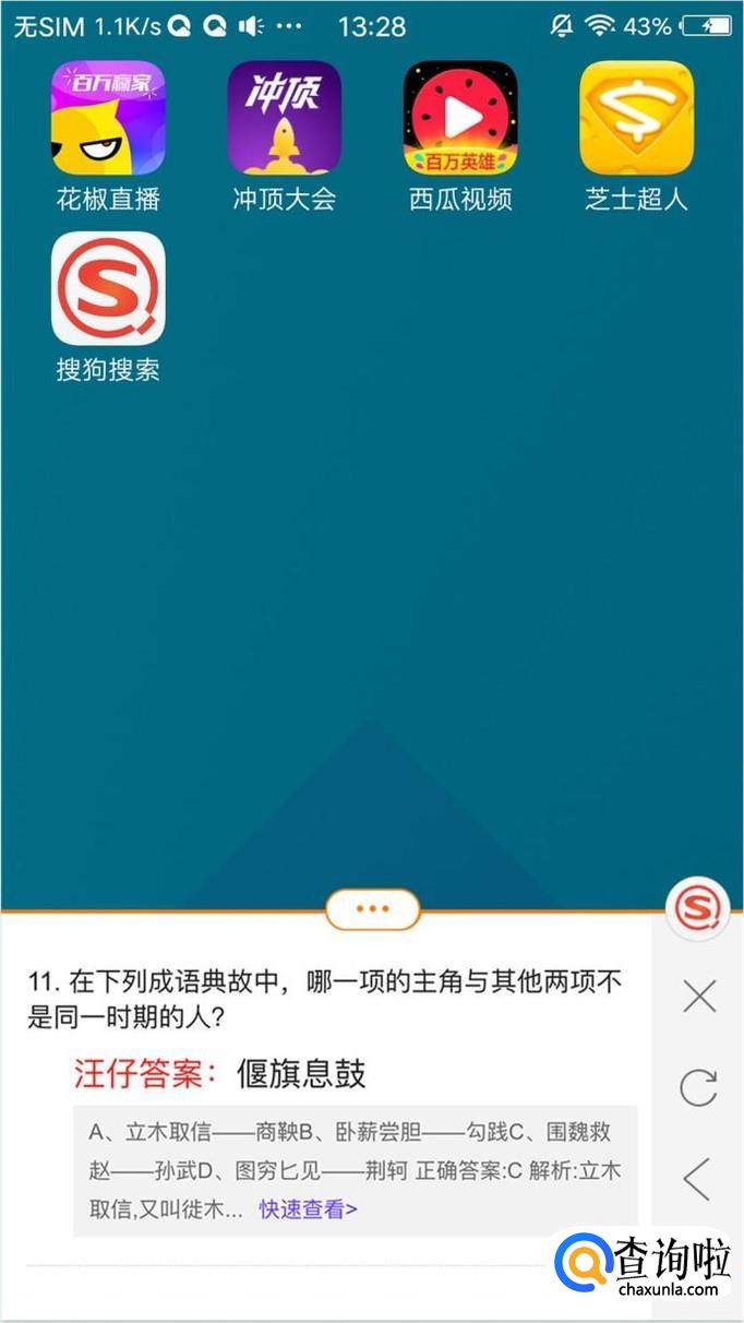 如果想一台手机看直播,一台手机看答案,那么只要打开搜狗搜索,进入底栏“答题”页,然后选择答题平台即可,页面内容会自动刷新,不需要手动操作;