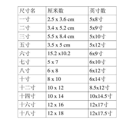 一代身份证照片:(黑白大头照):2.2cm x 3.2cm;二代身份证照片: 2.6cm x 3.2cm;黑白小一寸:2.2cm x 3.2cm;黑白大一寸:3.3cm x 4.8cm;彩色小一寸蓝底:2.7cm x 3.8cm;彩色小一寸白底:2.7cm x 3.8cm;彩色小一寸红底:2.7cm x 3.8cm;彩色大一寸红底:4.0cm x 5.5cm。