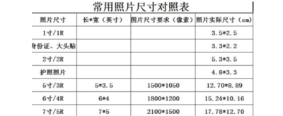 (1寸 / 2寸) 150-200KB 640x480(30万) 2.5×3.5cm/3.5x5.3cm ;小一寸: 2.2×3.2cm;大一寸: 3.3×4.8cm;小二寸: 3.5×4.9cm;大二寸: 3.5×5.3cm。