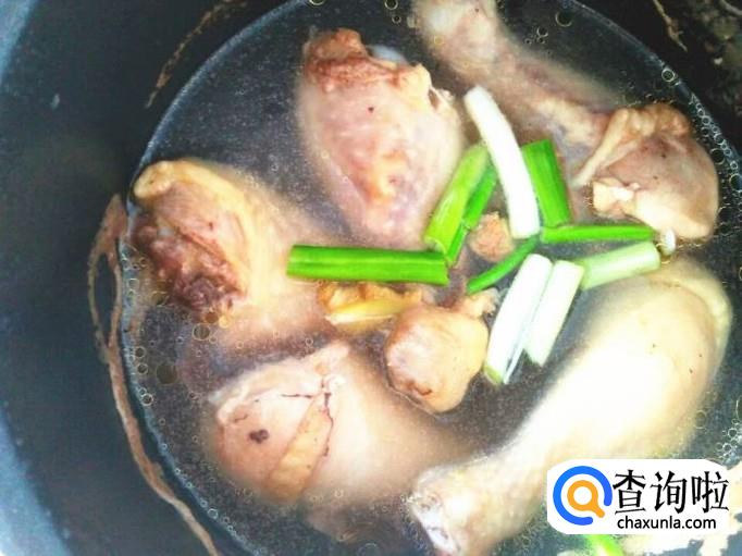 鸡腿煮开之后打开盖子,将葱段和生姜片放进去,然后关上盖子继续煮大概五分钟。