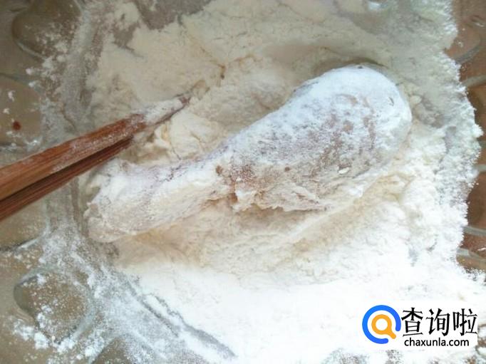 把控干水的鸡腿放进面粉里滚一滚,放鸡腿全部均匀的沾上面粉,记得用手捏一捏,能让鸡腿上的面粉粘得更牢固一些。