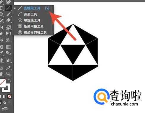 之后将六边形进行旋转,将顶点对齐三角形的顶点,如下图,然后选择“直线段工具”,绘制三条直线来连接小三角形的三个锚点。