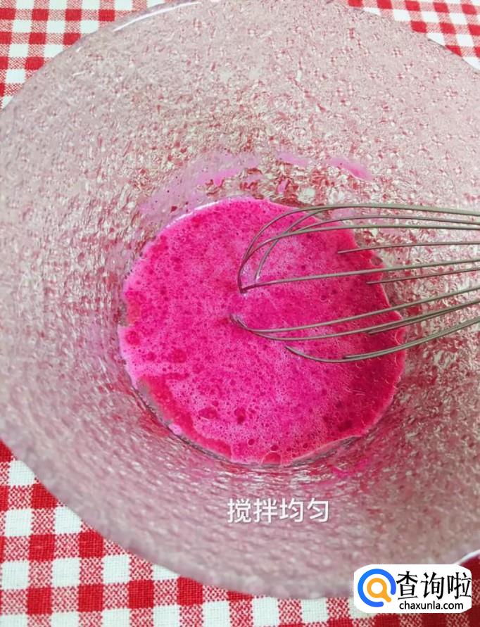 接着将玉米油、鸡蛋和火龙果汁混合,如下图所示。