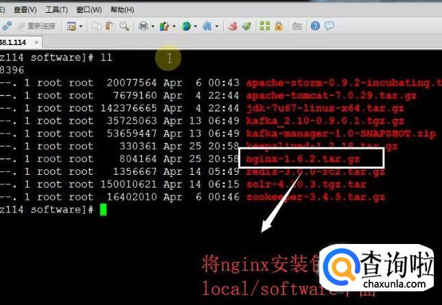 首先我们需要将nginx的安装包放到linux的/usr/local/software目录下面,如下图所示