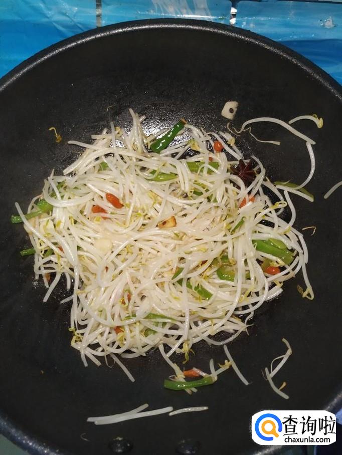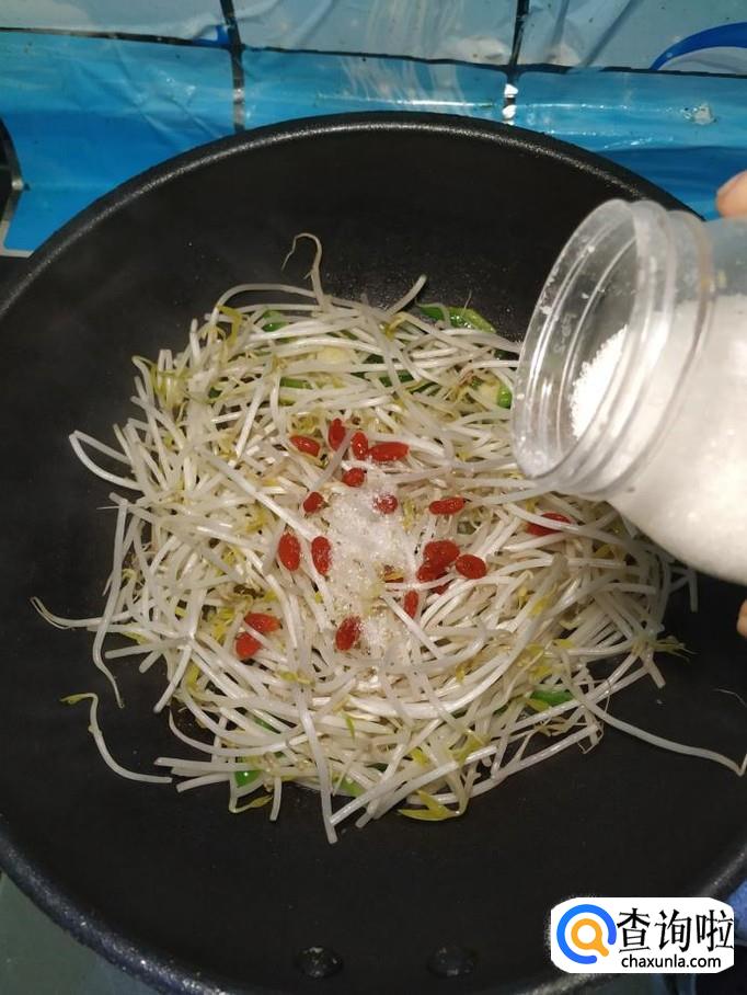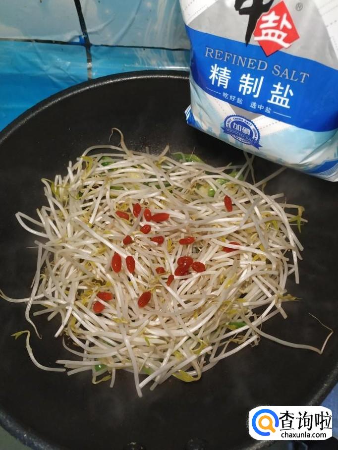将准备好的豆芽,倒入锅中,再加入适量泡好的枸杞子,翻炒均匀。