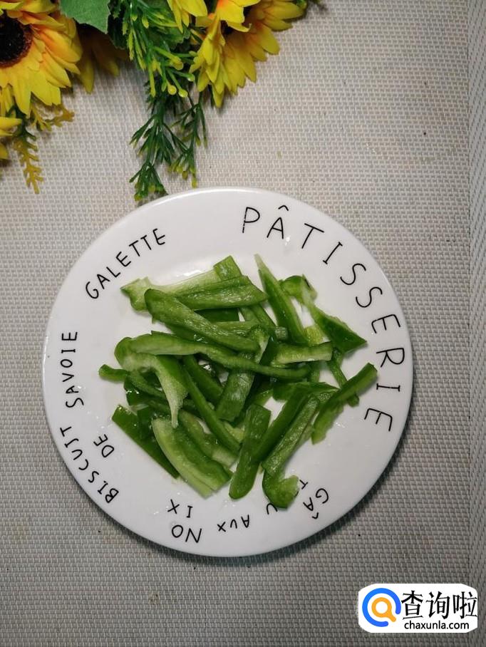 准备一个青椒,用清水洗净后切成丝,放入盘中备用,量不用太多,搭配一下,颜色更加好看。