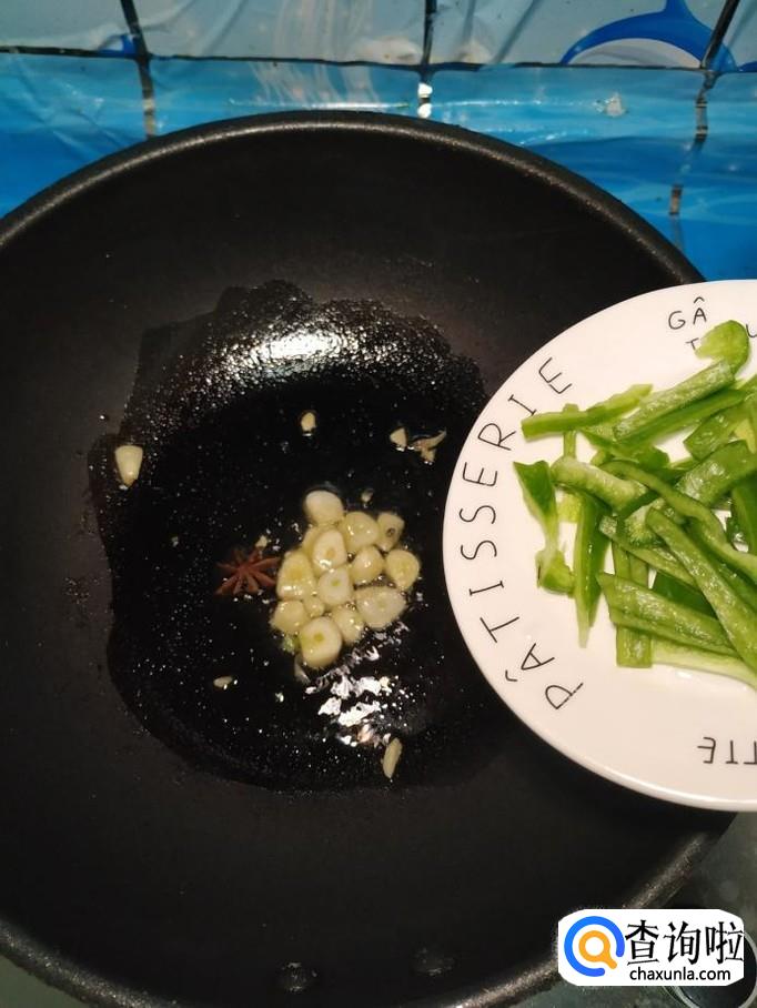 炒锅中放入适量油,油热后,放入蒜片爆香,然后将青椒倒入锅中,翻炒均匀,炒至青椒变软就可以了。