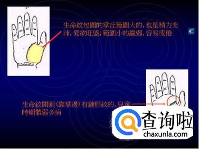 先来看看最基本的生命线,生命线 又叫做“地纹”。从食指下方沿着“金星丘”,环绕大拇指的线,影响的是健康与生命力的强弱。
