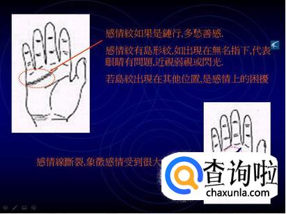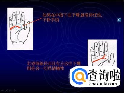 感情线又叫做“天纹”。从小指的下方朝食指的方向延伸的线,影响的是爱情的品质与态度等方面。