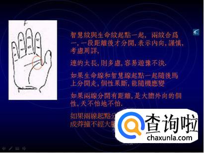智慧线又叫做“人纹”。从大拇指和食指中间出发,往“月丘”延伸的线,影响的是个性、思路方面。