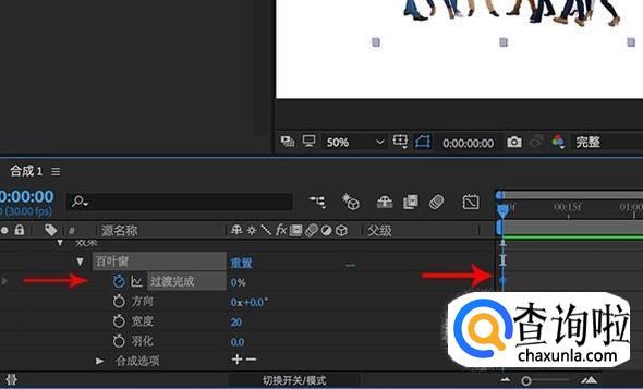 接着我们开始添加关键帧,在开始的位置将“过渡完成”设置为0%,打上一个关键帧。