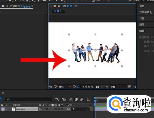 创建合成之后,这里我们拖入一张图片来作为示例,给图片添加的操作和视频差不多的,视频就是需要一个纯色固态层。