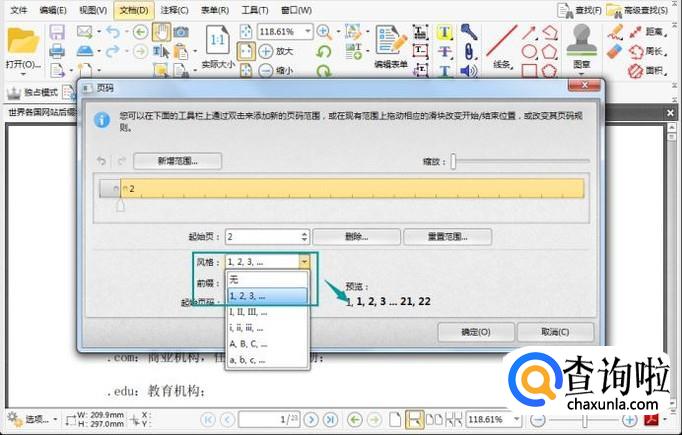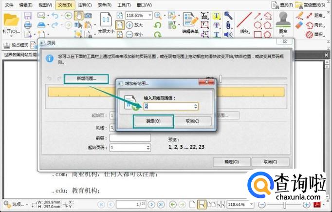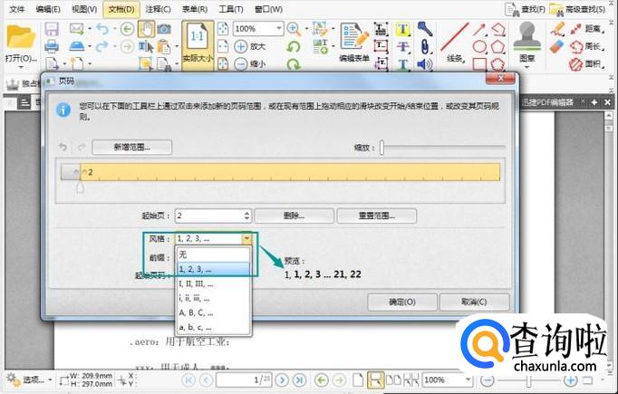 点击了编排页码按钮后,弹出一个页码设置菜单。因为我们是给pdf合同添加页码,所以合同封面一般都不会添加页码,所以我们点击新增范围按钮,在输入开始范围值文本框中输入2。
