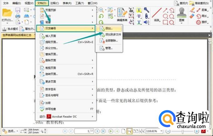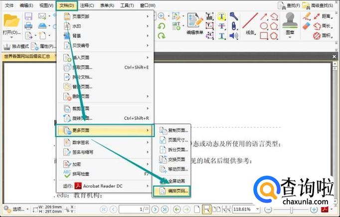 当我们用工具将PDF合同打开后,点击文档按钮,点击更多页面按钮,再选择二级菜单中的编排页码按钮。