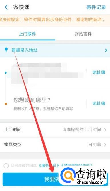 进入之后,填写好寄件人和收件人的信息,点击“我要寄件”,等着收快递人员来上门取件即可,如图所示。