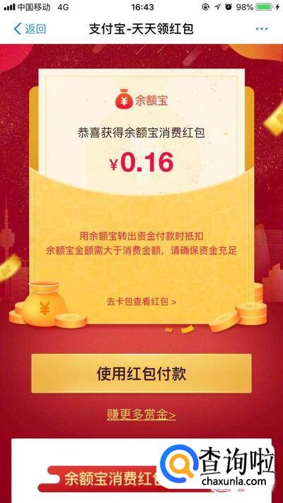 就可以每天领取一个小红包了,新用户或者不常使用支付宝的用户一开始可以领到几块甚至几十块的红包哦,像小编这种经常使用的用户基本每天领一毛钱到1元钱左右,这个红包使用的前提是余额宝有钱,付款时大于红包的金额就可以使用红包抵扣消费了。