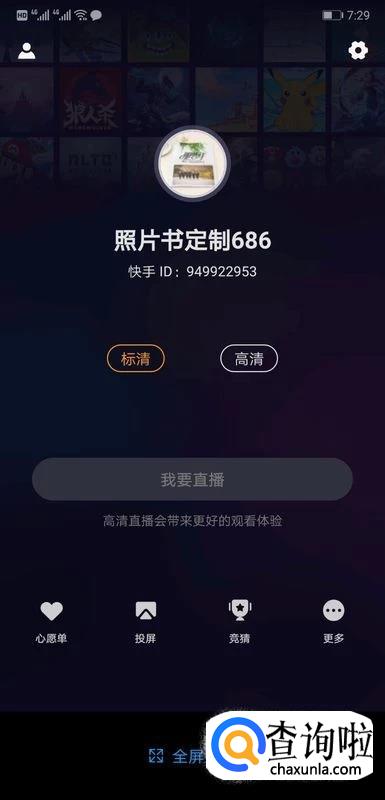 登录之后根据自己手机的情况选择适合自己的画质,可供选择的有【标清】和【高清】,一般来说为了直播的效果选择高清会好很多,然后点击下方的【投屏】即可将手机上的画面显示到电脑屏幕上去。