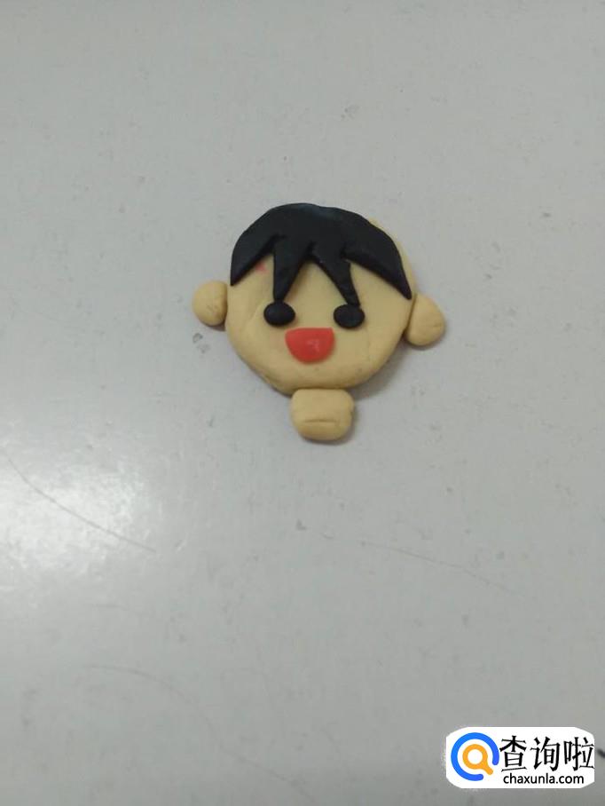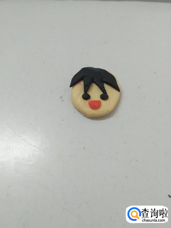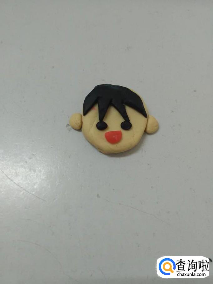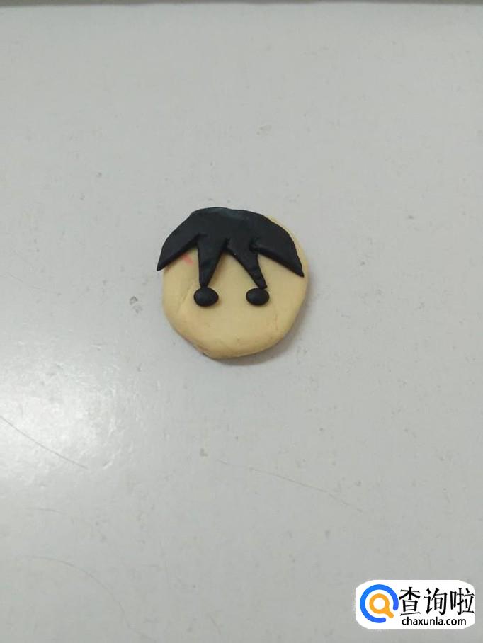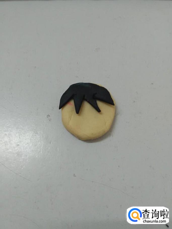 用黑色捏一个半圆,用小刀在下边刻去几个小三角形,当作人的头发,把头发粘在人的头部上方。
