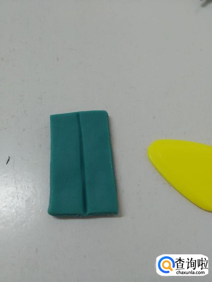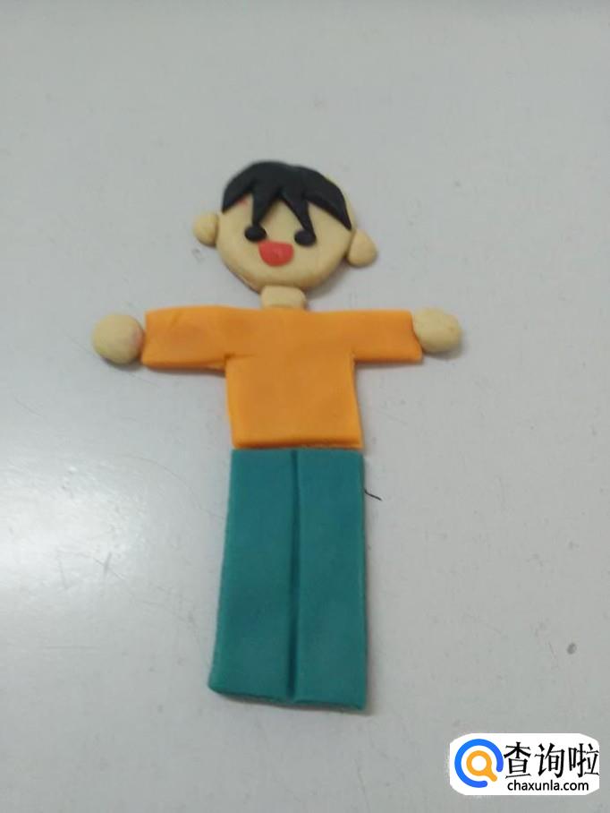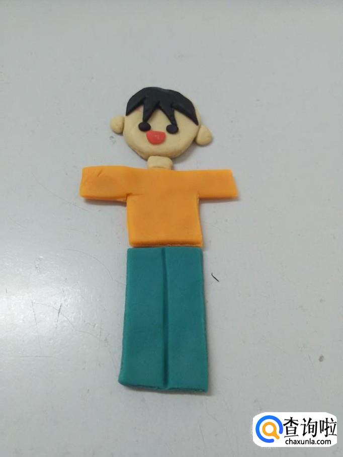 用蓝色捏一个长方形,用小刀从中间刻一条竖线,粘在上衣的下面,当作裤子。