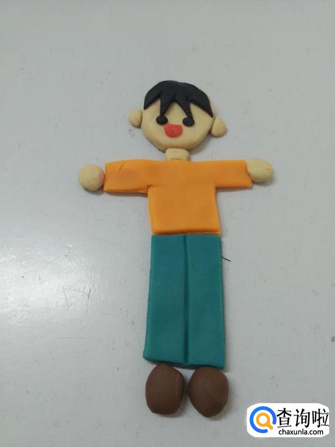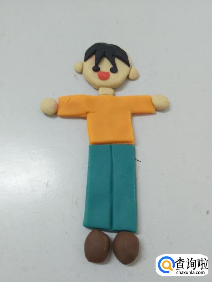 用棕色团两个椭圆形,粘在两条裤腿下面,当作两只鞋,泥人就捏完了。