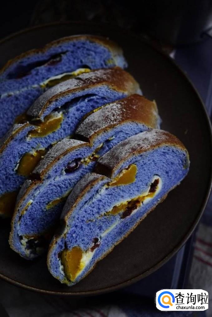 放入模子中,盖上盖子,继续常温发酵1小时,至8分满的时候放入烤箱,170℃,45分钟就可以取出了。完美的蓝色多瑙河吐司就完成啦!