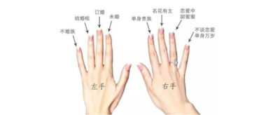 而按照我国的习惯,右手小指:不谈恋爱。右手无名指:热恋中。右手中指:名花有主。右手食指:单身贵族,等待爱情。左手小指:不婚族。左手无名指:结婚。左手中指:订婚。左手食指:未婚。大拇指都是代表权势的意思,也可以做自信的意思。