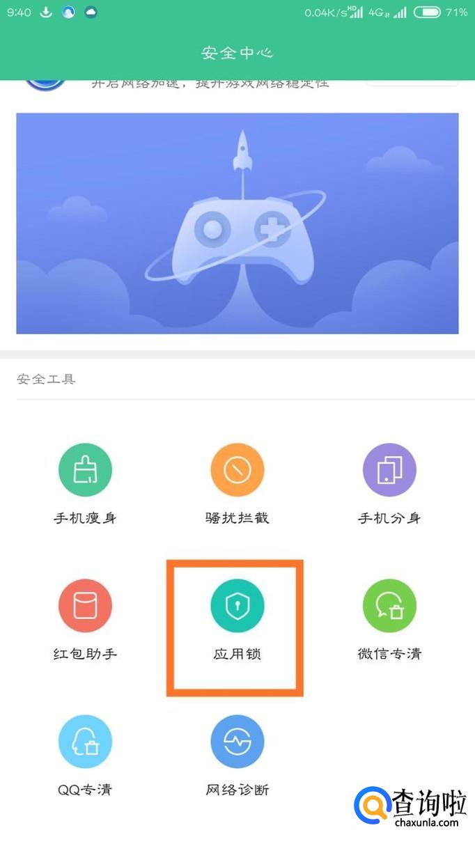 在主页面里面向下拉,在安全工具里面找到应用锁,点击进入。