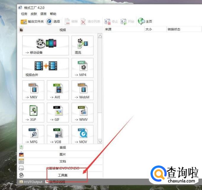 这里我以格式工厂软件为例,打开格式工厂软件之后,点击主页面中的“工具集”菜单。