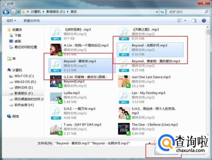 按下Ctrl键并选择要合并的两首歌曲文件,点击“打开按钮”,即可添加到软件的任务列表中。