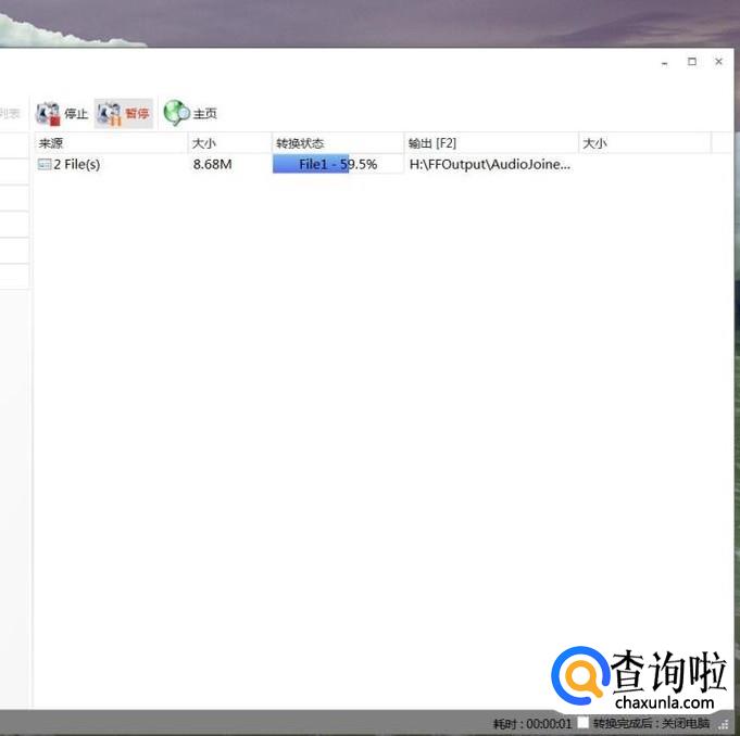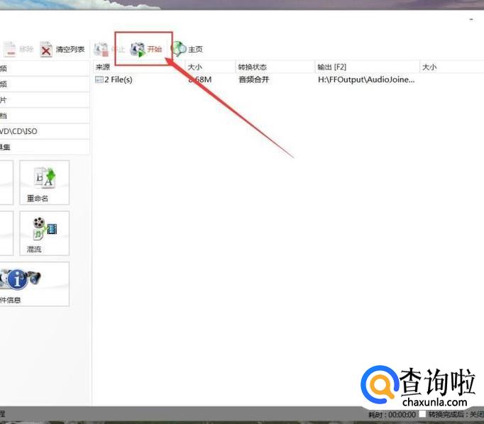 在软件任务列表菜单中,点击页面上方的“开始”按钮,点击之后即可开始两首歌曲文件的合并。