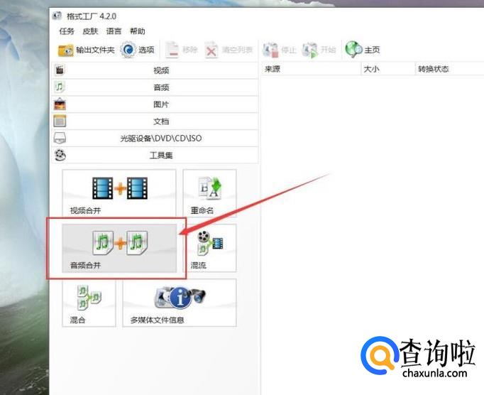 打开工具集菜单选项之后,选择“音频合并”功能选项,进入音频合并功能。