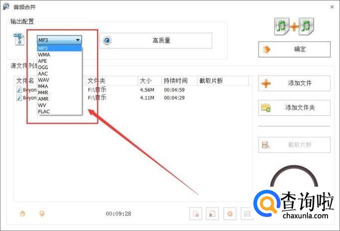 在软件界面中,点击文件格式下拉菜单,可以选择合并之后的音频文件格式,可以选择MP3或者是其他文件格式。