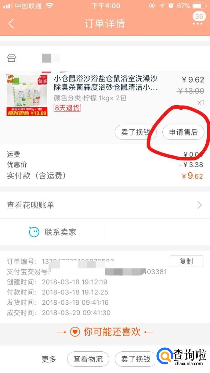 点击进入“我的订单”,然后找到你想要申请售后的订单,点击进入,可以看到“申请售后”小编这里随便选择了一个,如图所示。