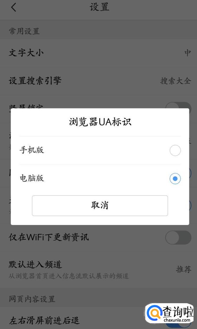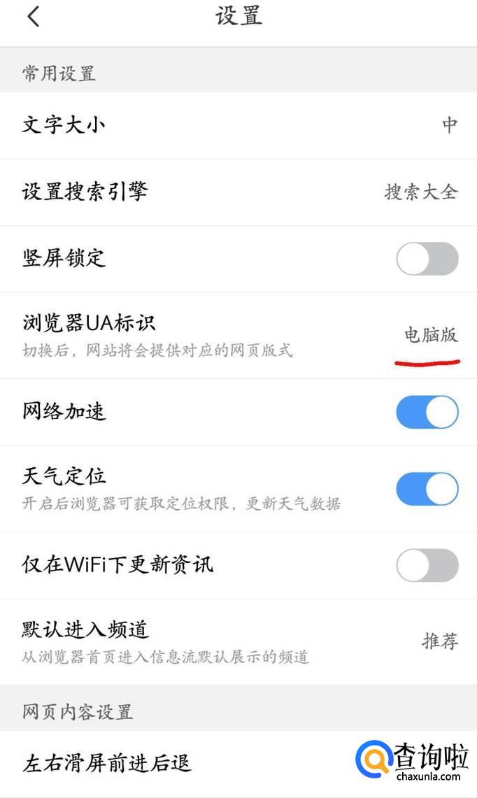 选择菜单栏里面的“浏览器UA标识”选项点击选中电脑版。