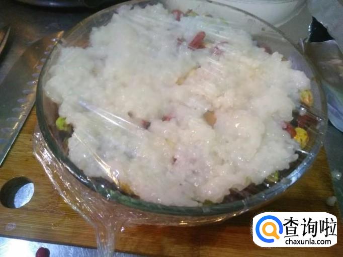 再铺上一层糯米,压平,并用保鲜膜包好。