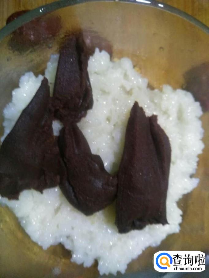 然后小心地铺上一层糯米,并在糯米上铺上一层红豆沙。