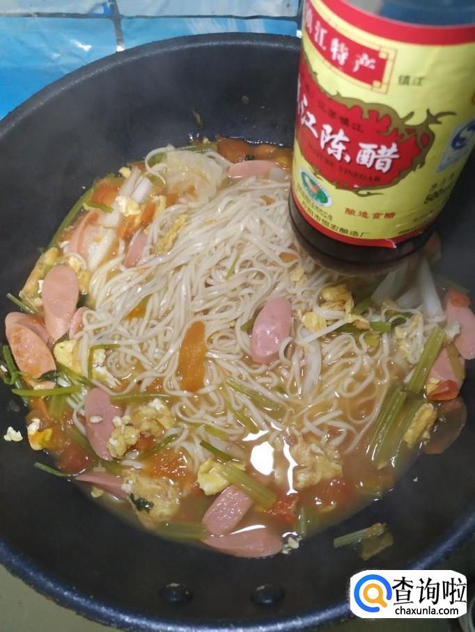 芹菜适量,西红柿适量,香肠适量,面条适量,鸡蛋适量,盐适量,鸡精适量,五香粉适量,生抽适量,陈醋适量。