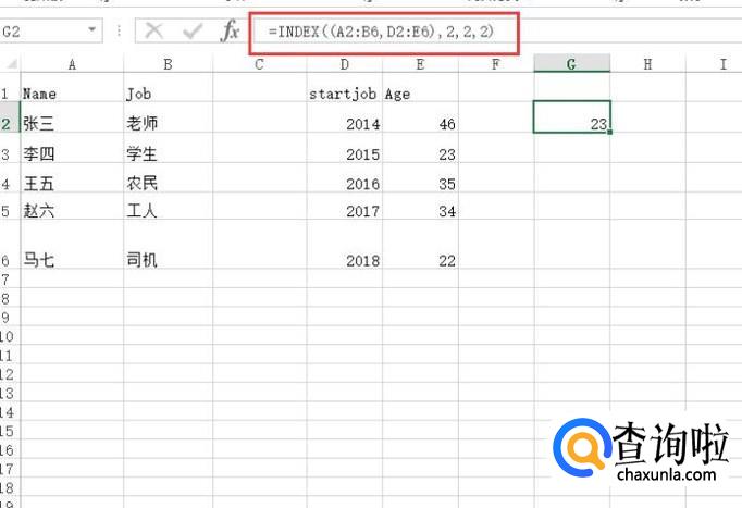 最后Index函数还可以定位多个数据表,如下图所示,第一个参数指定了两个数据区域,这样如果想定位第二个数据区域中的值就需要三个参数了,如下图所示